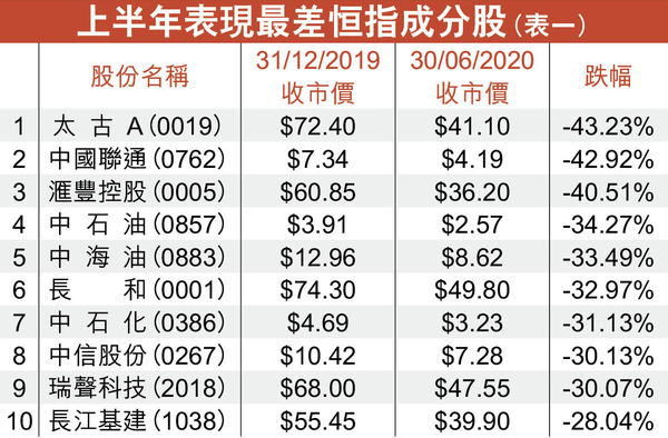 由於篇幅所限,上次沒有進一步再分析。今日我想跟大家從兩個跌幅榜去看看未來的投資趨勢,一個是恒指跌幅榜(見表一),另一個是國指跌幅榜(見表二)。在恒指跌幅榜之中,除了滙豐是英資公司之外,跌幅最大的太古A(00019)也是另一家老牌英資公司。